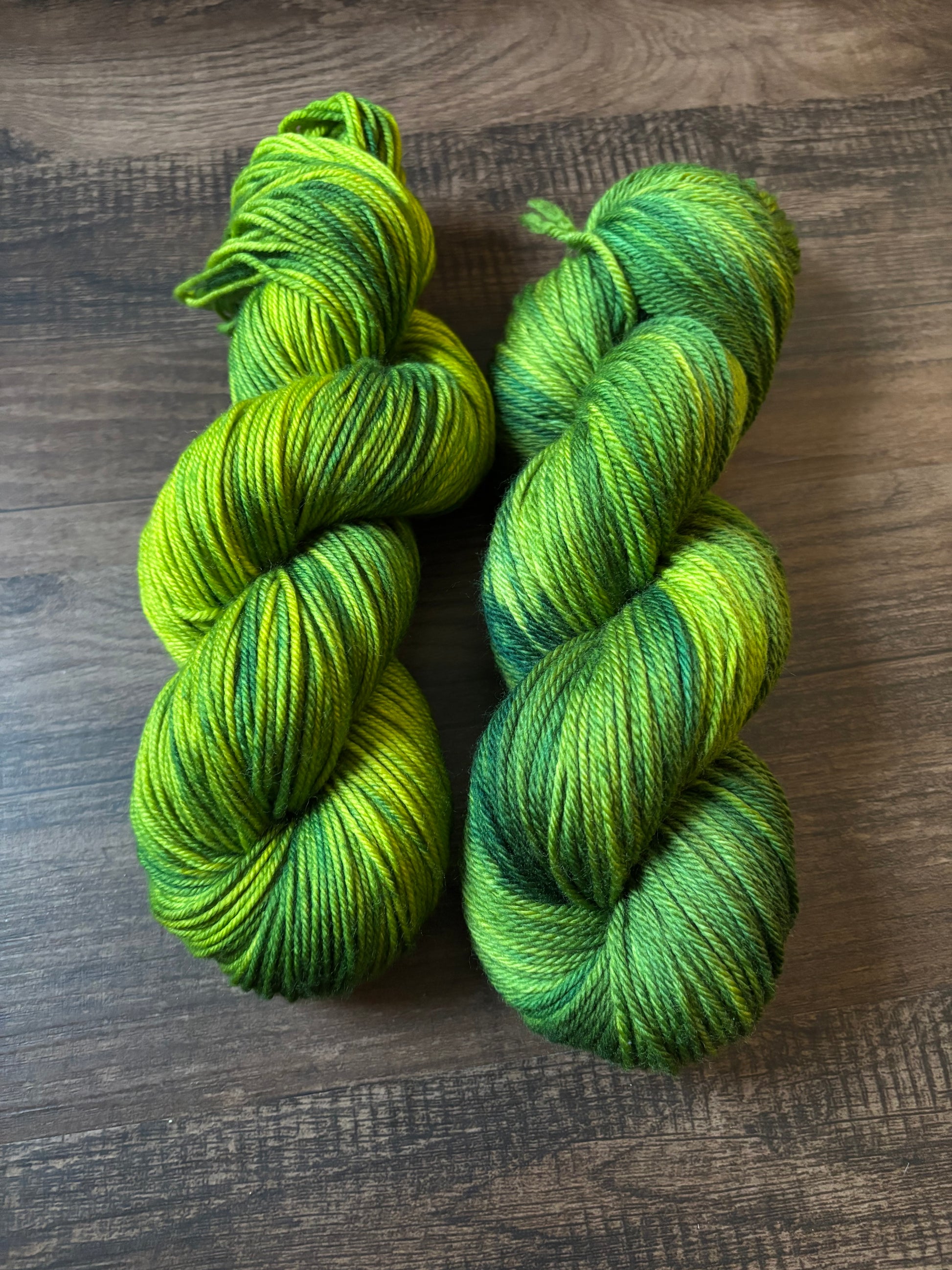 This is a multi-green OOAK hank. This color was my first attempt at "Frog's Breath" in the Sally's Ingredients collection, but I went with different greens. Only 1 available in DK weight.