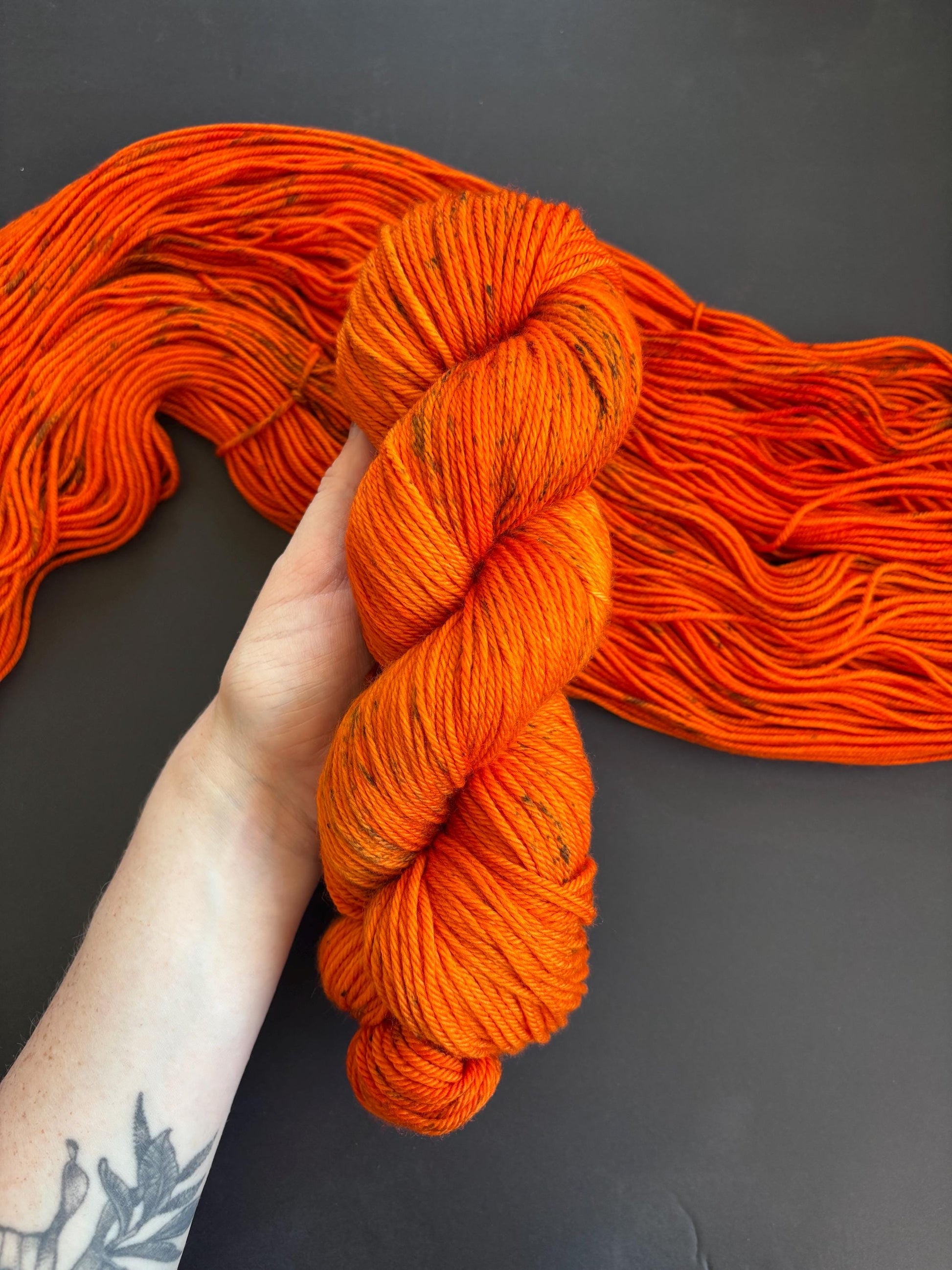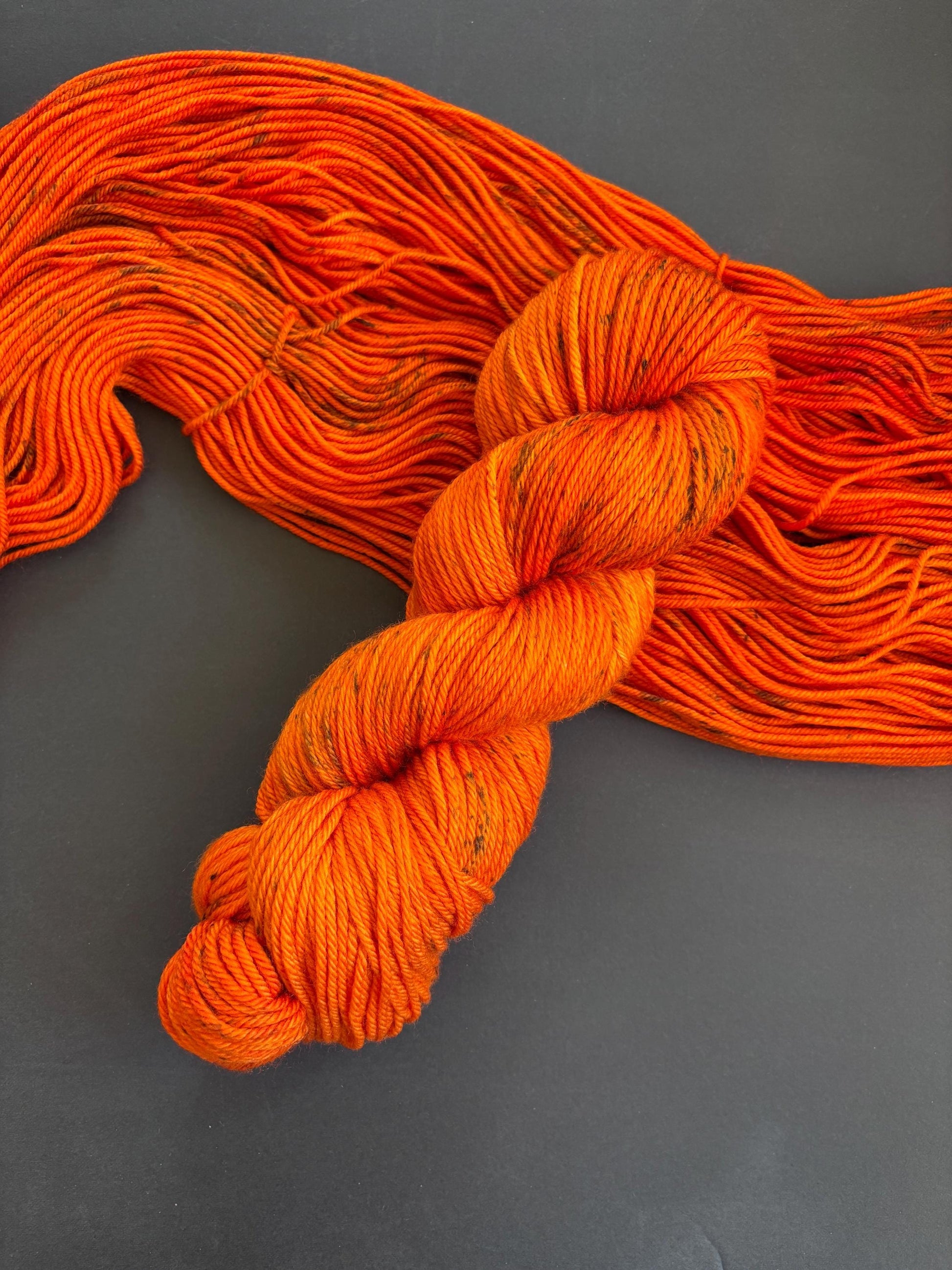 PUMPKIN SPICE - vibrant orange with speckles of black randomly scattered throughout the yarn.