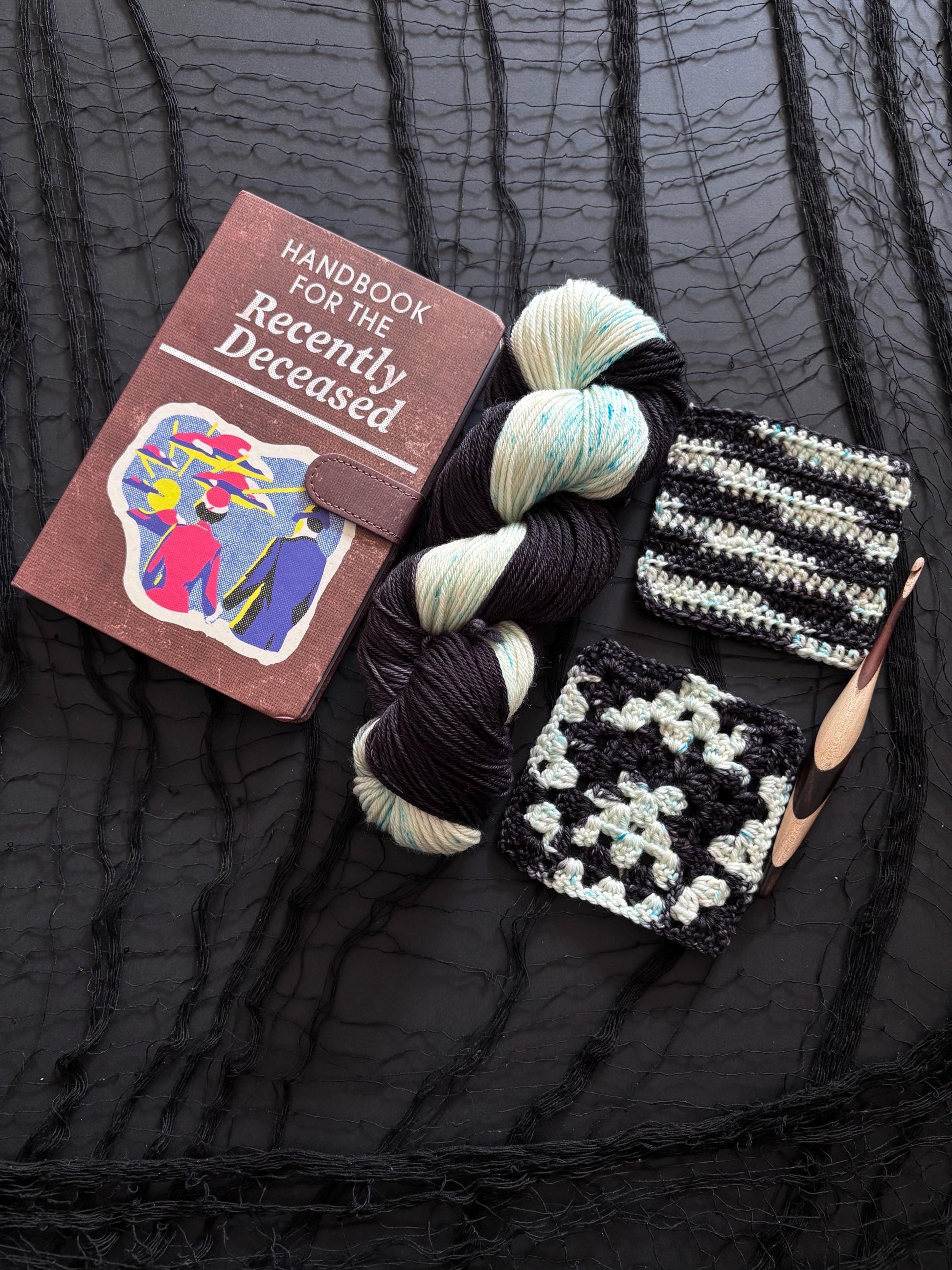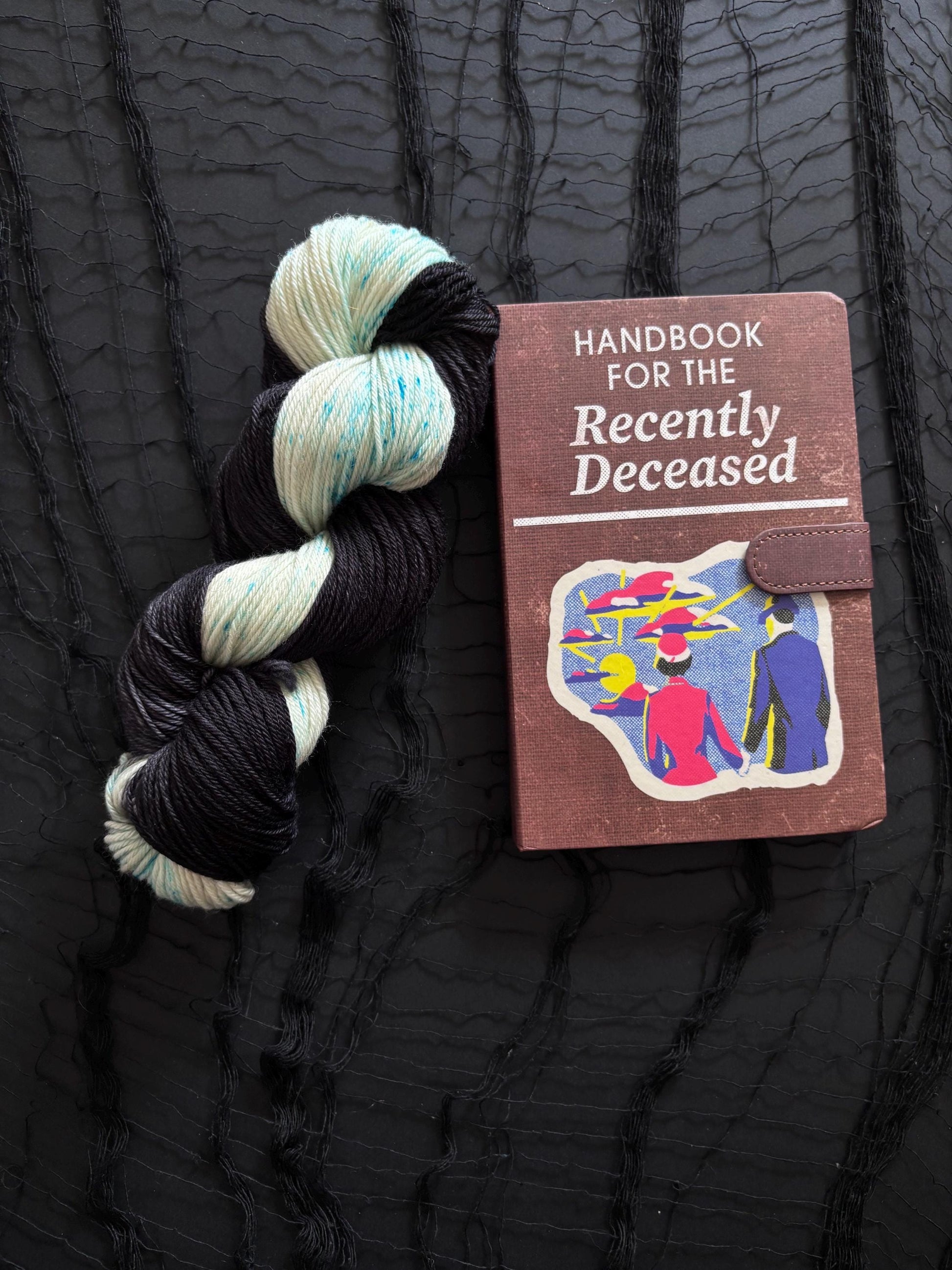 SANDWORM - Based on a halloween classic, this yarn is half black, half white with speckles of turquoise.
