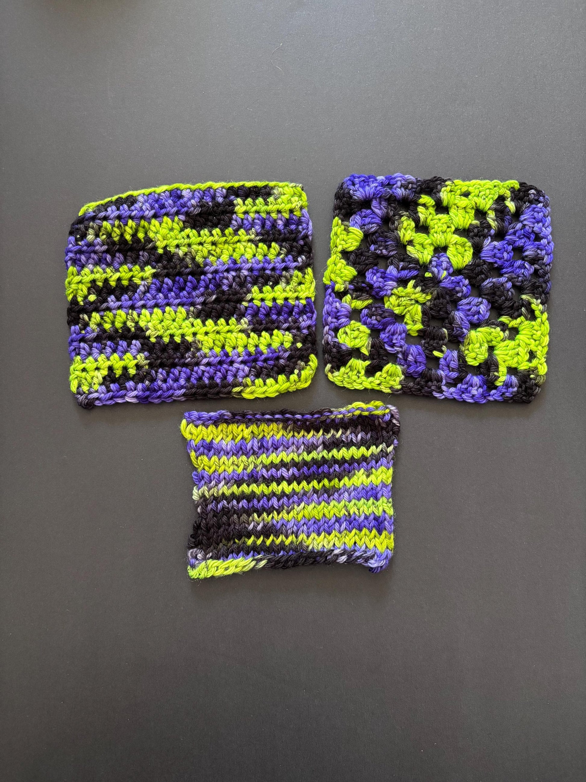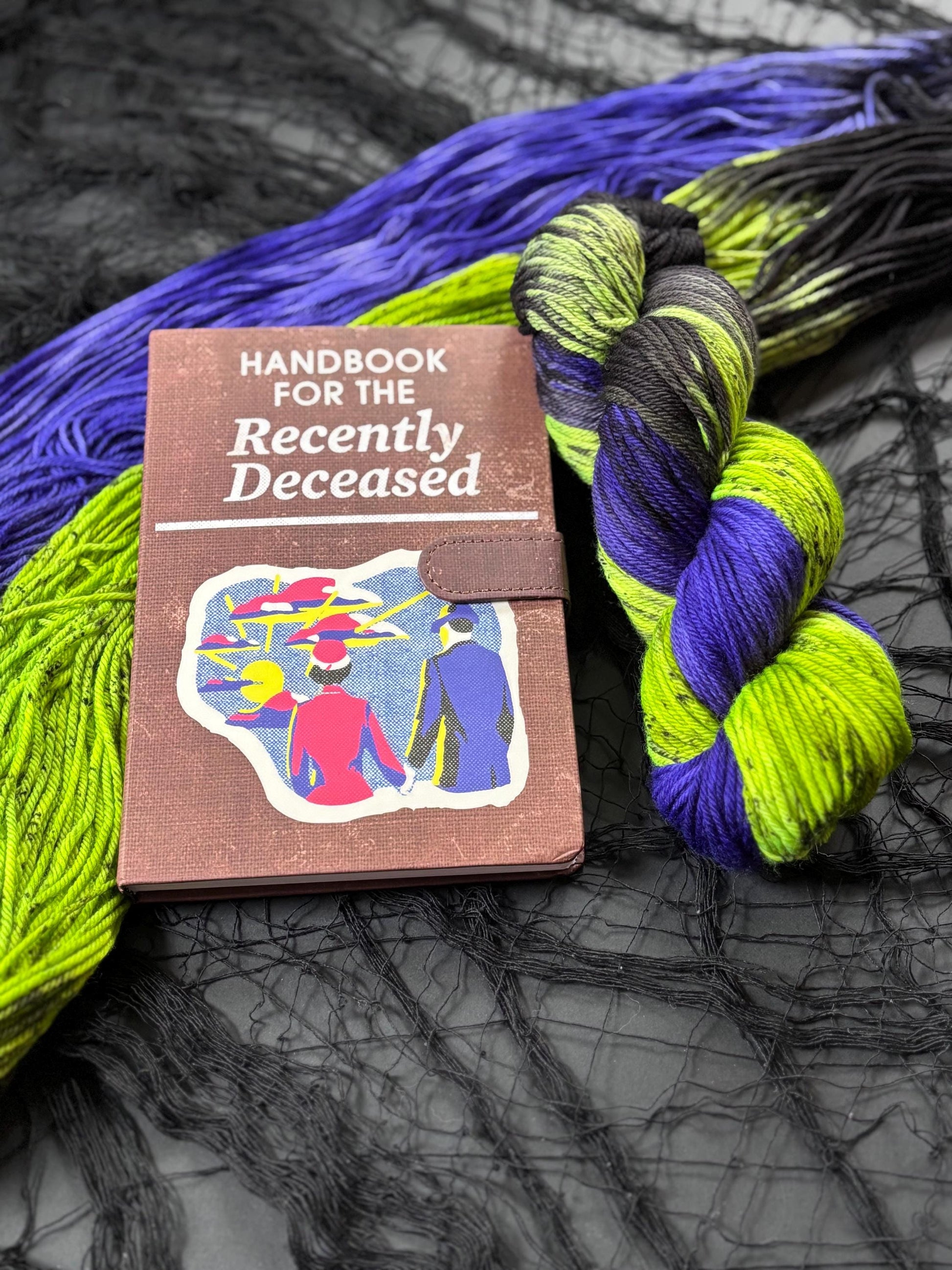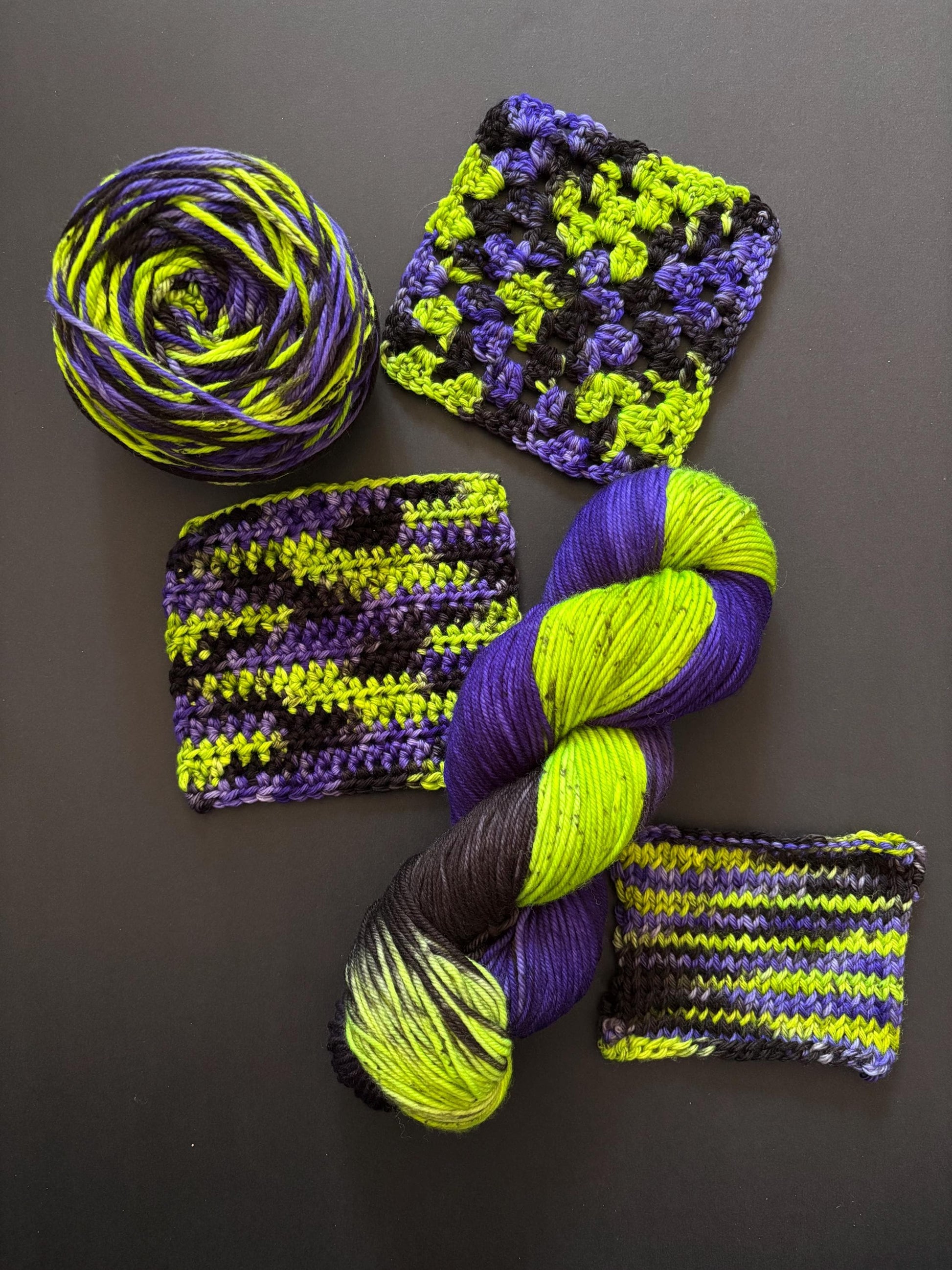 IT'S SHOWTIME - Based on a halloween classic, this yarn is a mixture of green, purple, and black. The green has black speckles to give the green that gritty look that the ghost with the most has ;)